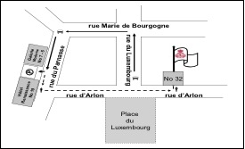 • Le plus simple, si vous arrivez place du Luxembourg, est de prendre : la rue du Luxembourg en direction de la Petite Ceinture et du Palais Royal, ensuite, dans la rue du Luxembourg, prenez directement la première rue à gauche : c’est la rue Marie de Bourgogne, enfin, la première rue à gauche : c’est la rue du Parnasse.